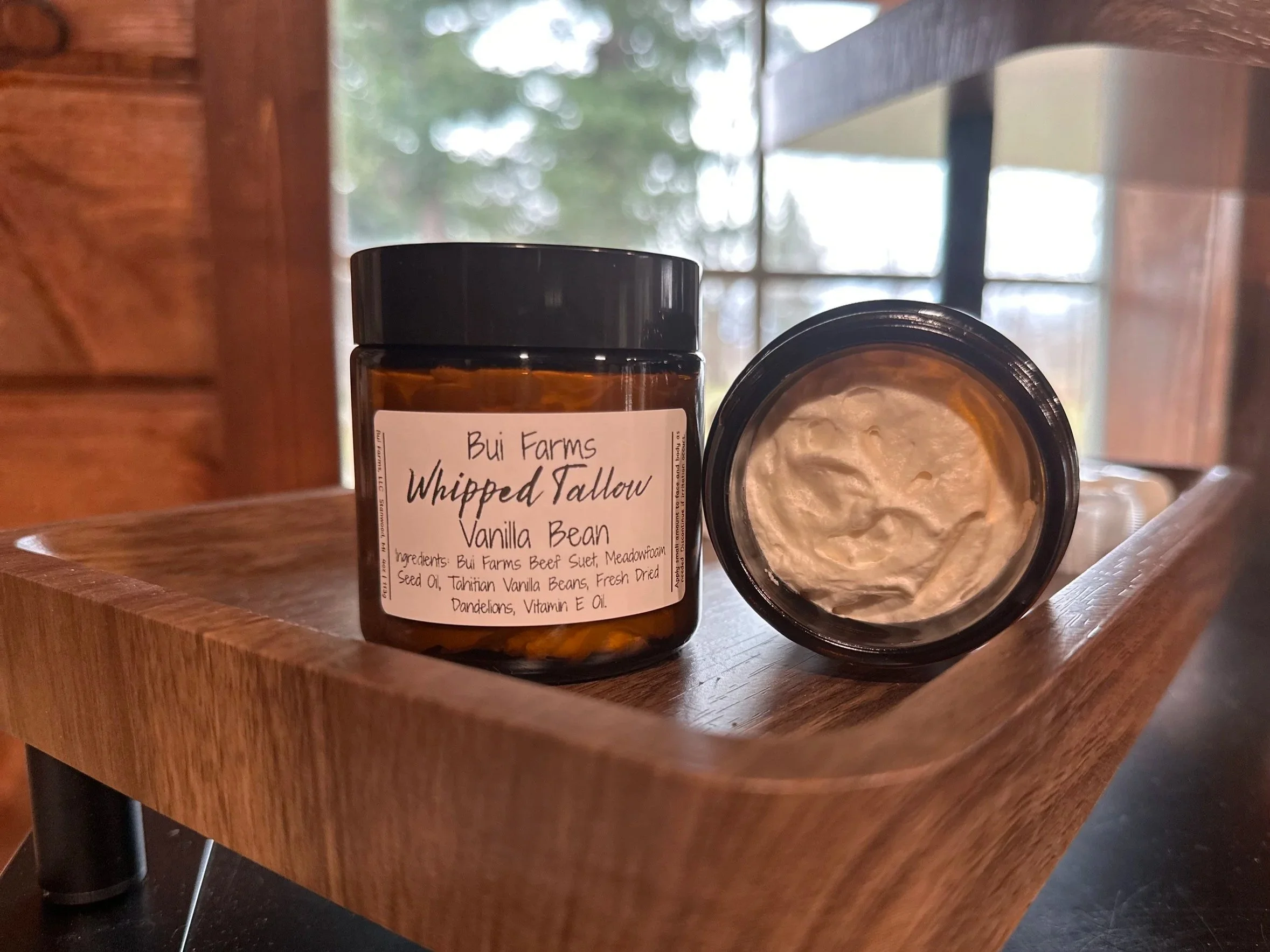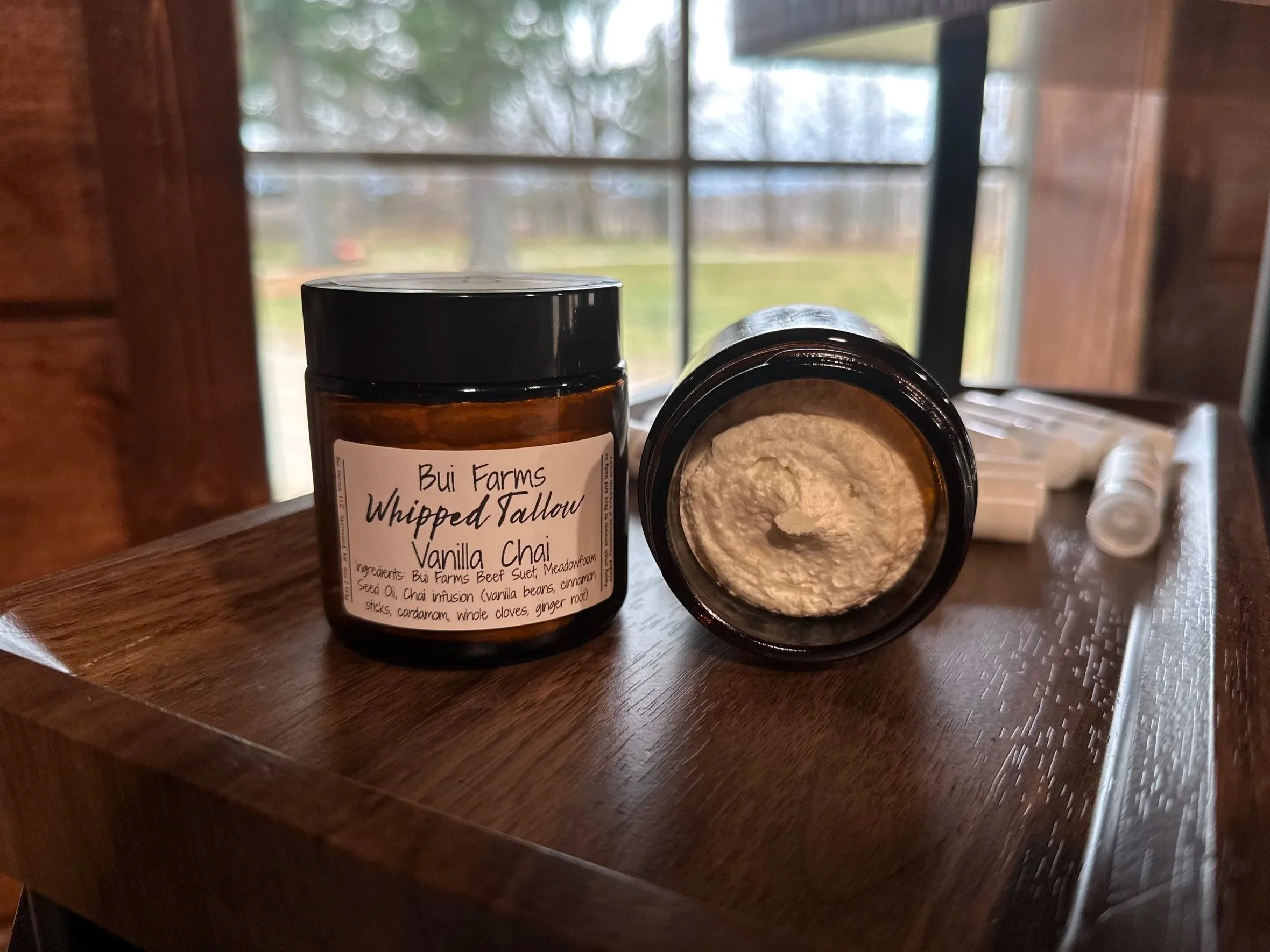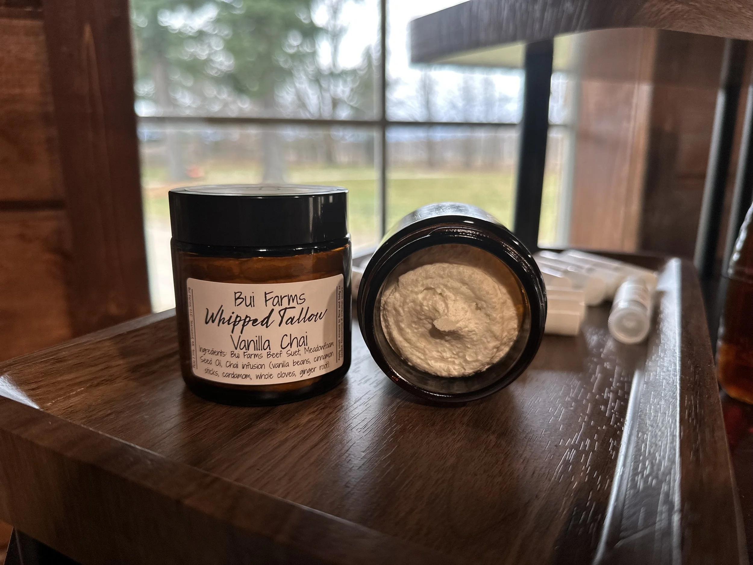 Products Peppermint Tallow Lip Balm $6.00 Add to Cart Added! Vanilla Chai Whipped Tallow $30.00 Add to Cart Added! Vanilla Bean Whipped Tallow $25.00 Add to Cart Added! Unscented Whipped Tallow $20.00 Sold out Sold Out Added!